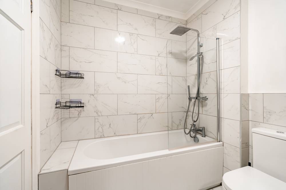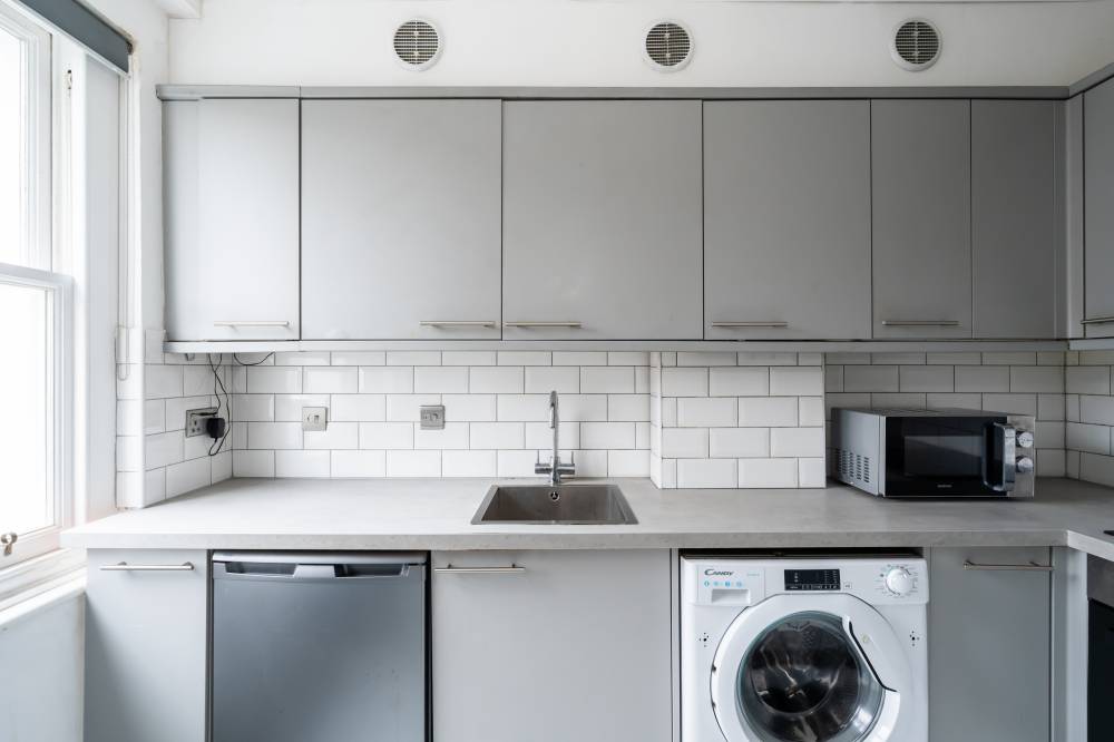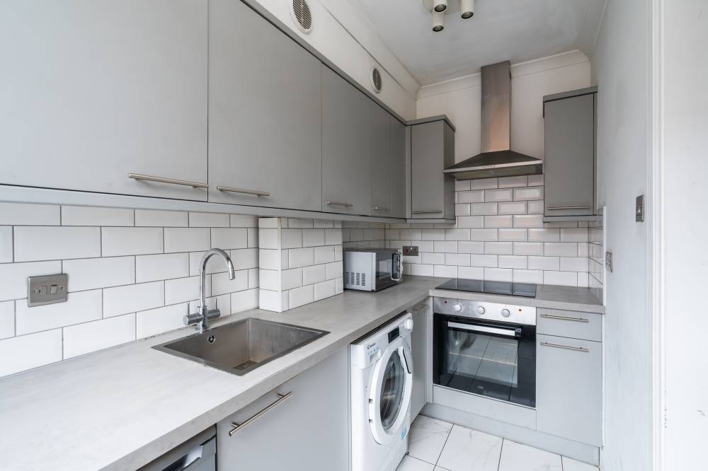 The accommodation briefly comprises: reception/dining room with bright neutral décor, laminate flooring and space for a small table and chairs, stylish kitchen which has been fitted with a variety of contemporary base and wall mounted units, complete with attractive splash tiling and a range of built-in appliances, double bedroom with fitted wardrobes, and sleek modern bathroom with two piece white suite and over-bath shower/splash screen.