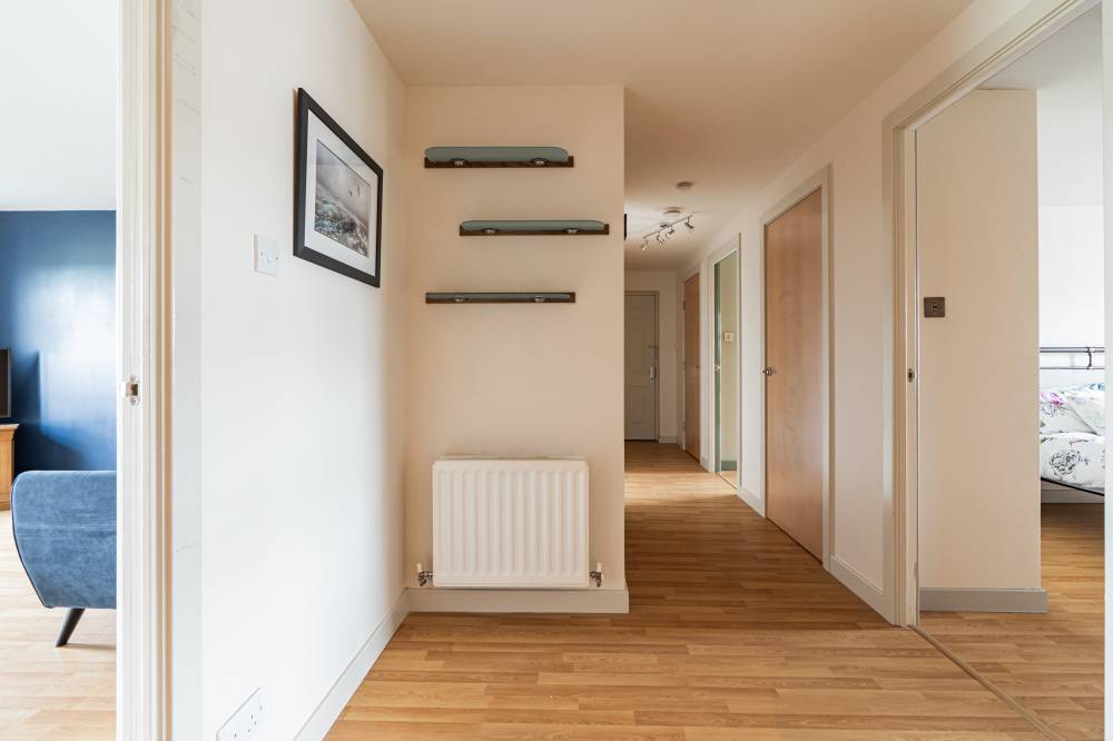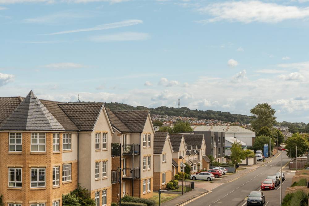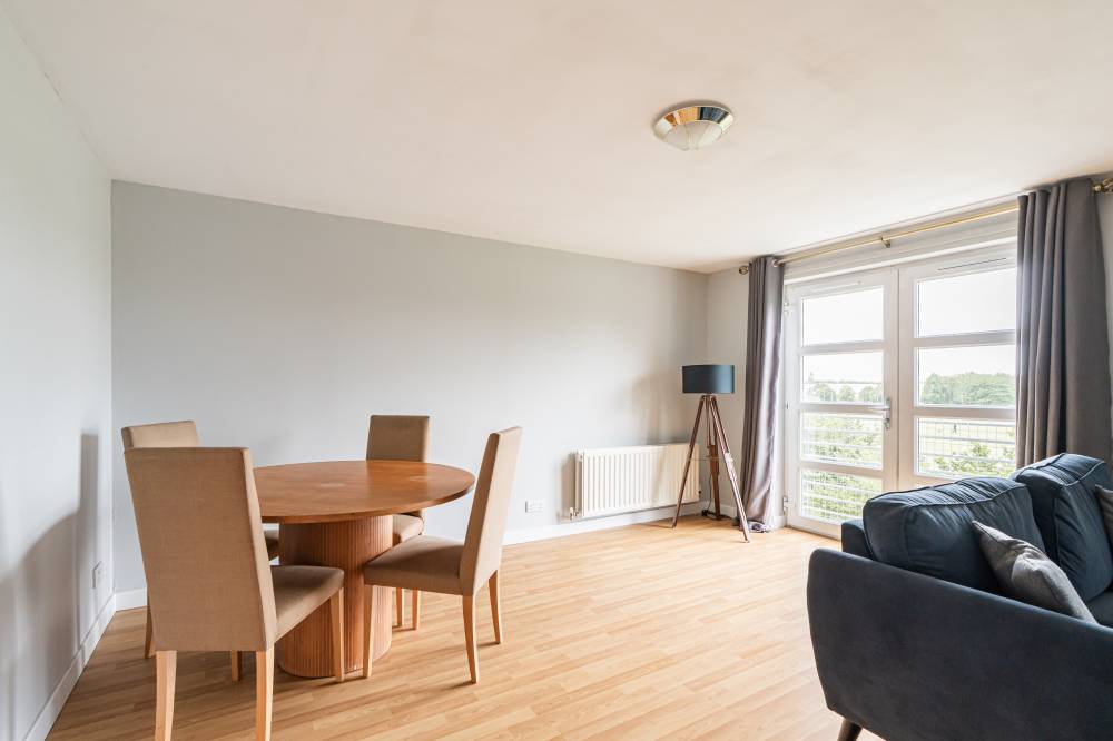 A welcoming entrance hallway leads into a generously sized lounge, which benefits from French windows and an additional side window that together flood the room with natural light while providing pleasant views across Gyle Park, creating a sense of space and tranquillity. The bright and sunny breakfasting kitchen is fitted with a range of base and wall-mounted units, complemented by co-ordinating work surfaces and tiled splashbacks. A practical breakfast bar provides a casual dining space, ideal for morning coffee or informal meals. There are two comfortable double bedrooms with views towards Corstorphine hill, with built in storage available in one of the bedrooms. The bathroom is fitted with a three-piece suite, including a shower over the bath and a modern vanity unit with integrated sink and storage below.