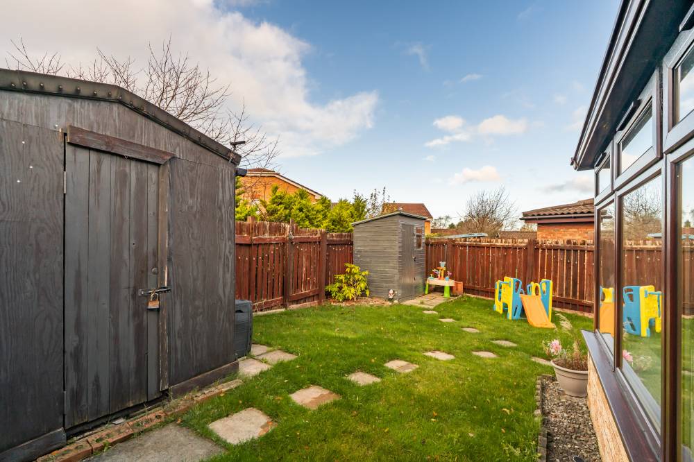 There is a small area of private garden located to the front, fully enclosed with chip stones for ease of maintenance with pathway to entrance. The good sized private garden to the side/rear is again fully enclosed with a paved patio and lawn with two garden sheds. An allocated parking space is located within the cul-de-sac.