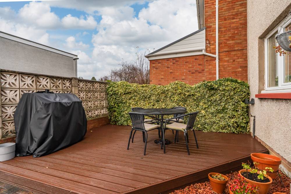 Externally, the private gardens include a chip stone courtyard, wooden deck with BBQ area, and a wraparound lawn. For the car owner, there is a single lock-up garage nearby as well as shared off-street parking available for residents.
