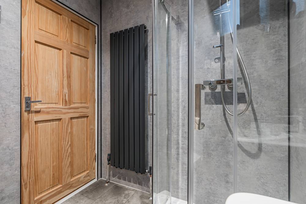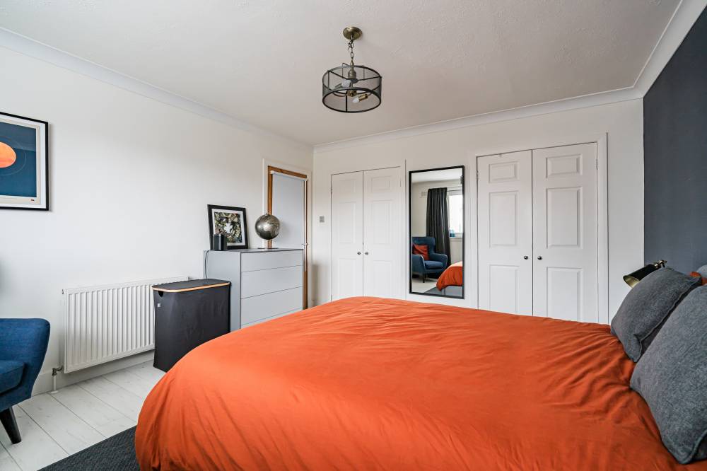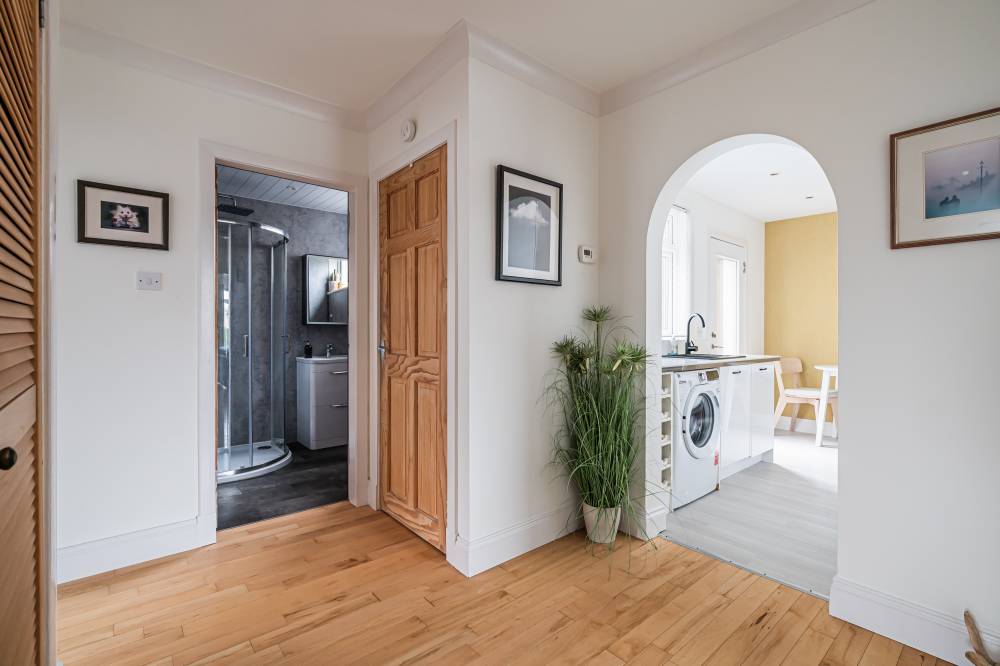 A welcoming entry hallway provides handy storage provisions and leads into the bright and spacious lounge, enhanced by a feature wooden panel wall and a lovely large window that draws in natural light. The modern kitchen offers a range of integrated white goods, fresh white units, and space for a breakfast table, with direct access to a private chip-stone courtyard. Bedroom one is a large double with two integrated double wardrobes, while the generous second bedroom is a front-facing double with its own integrated double wardrobe. Both rooms offer space for freestanding furniture and flexible layouts. The stylish shower room – upgraded in January 2025 – has been fully panelled for easy maintenance and features a corner cubicle with rainfall shower and an LED mirrored cabinet.