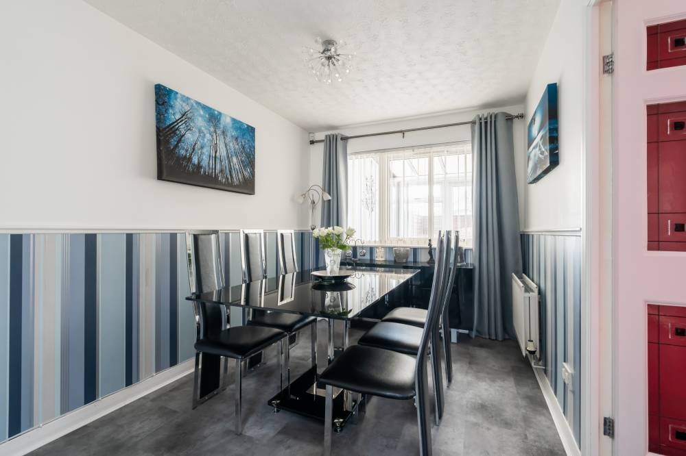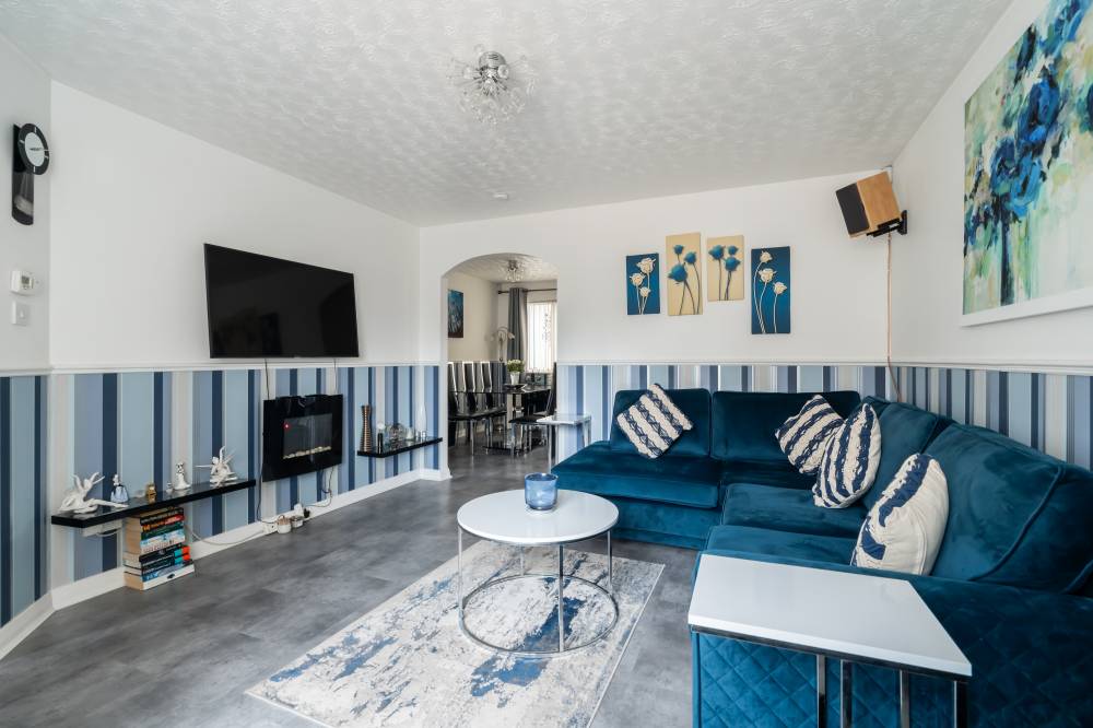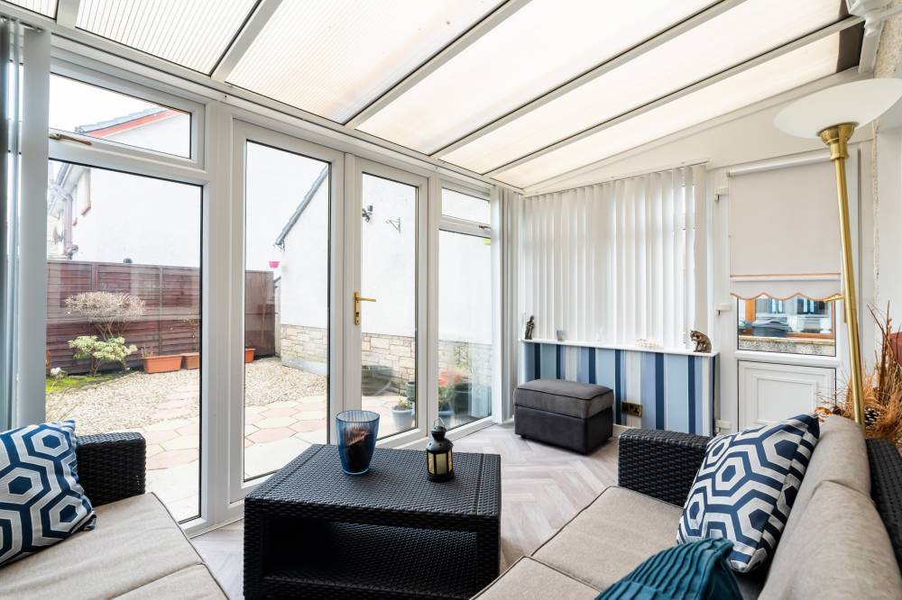 A welcoming vestibule leads into the main hallway, setting the tone for the bright and well-maintained accommodation. The lounge/diner is light and airy, with the lounge positioned to the front and a defined dining area to the rear, ideal for both everyday living and entertaining. A useful understairs cupboard provides additional storage. The kitchen is fitted with a range of integrated white goods, tall storage units, stylish stone worktops, under-unit lighting, and tiled flooring, offering a practical and contemporary workspace. Flowing from the kitchen is a bright conservatory enjoying a dual-aspect outlook and French doors opening directly to the rear garden, creating a lovely additional living space. Completing the ground floor is a fully tiled two-piece WC.