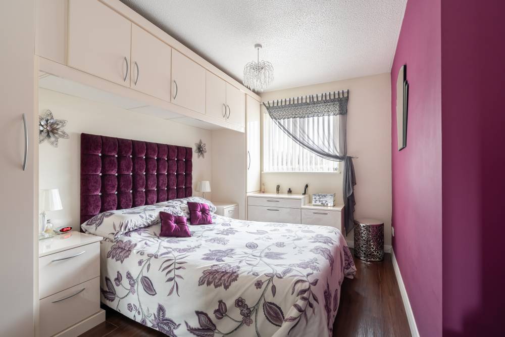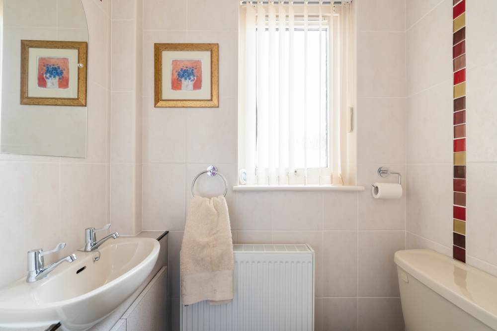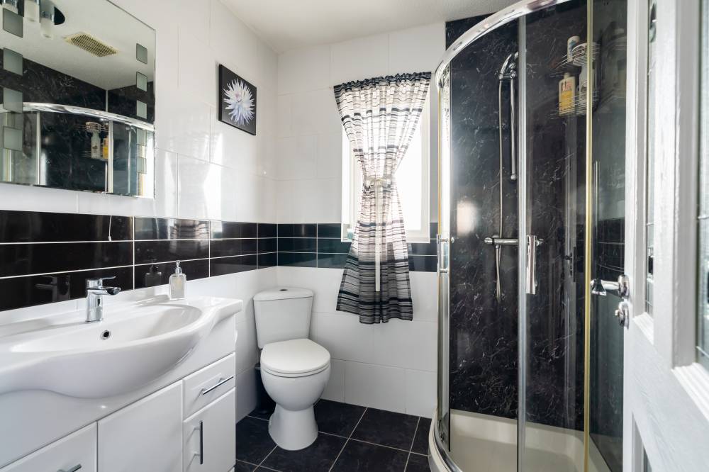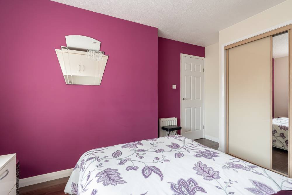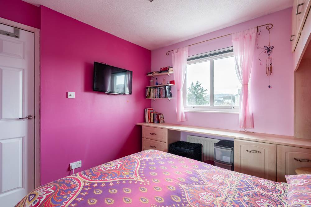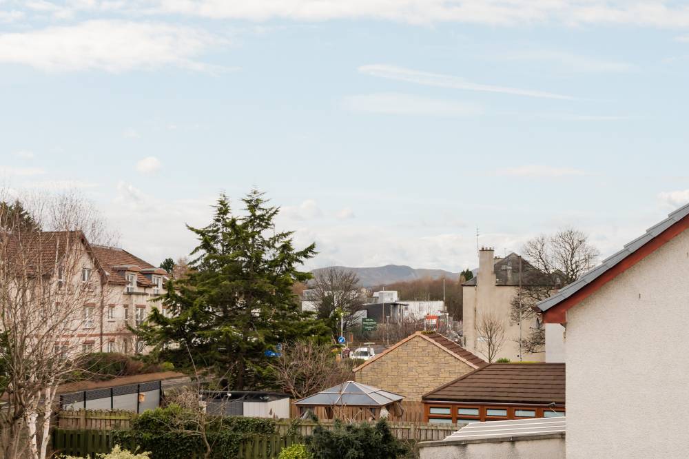 Upstairs, the landing benefits from a shelved linen cupboard and access to a partially floored attic via a Ramsay ladder. The principal bedroom is a good-sized front-facing double featuring extensive fitted storage and integrated sliding-door wardrobes. Bedroom two is a rear-facing double with fitted storage surrounding, an integrated dressing table, sliding-door wardrobes, and attractive views towards the Pentland Hills. The third bedroom is a well-proportioned single, also benefiting from fitted storage and an over-stairs cupboard. The shower room is finished with a corner shower cubicle, partial tiling and panelling, and a heated towel rail.