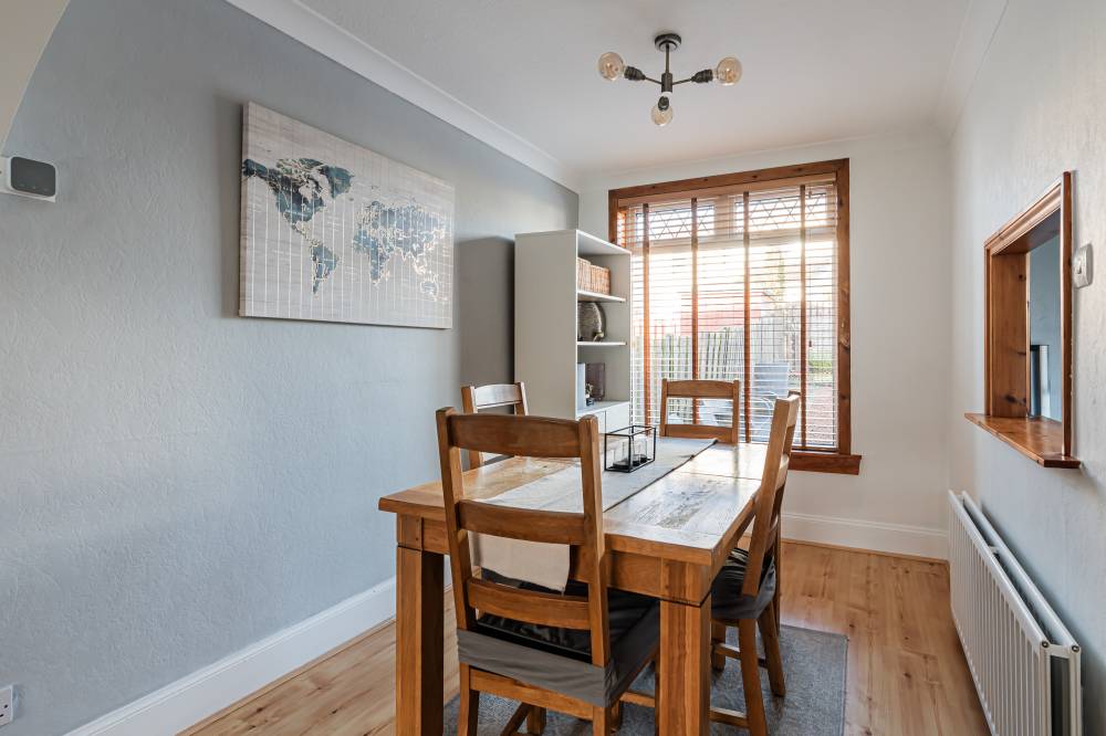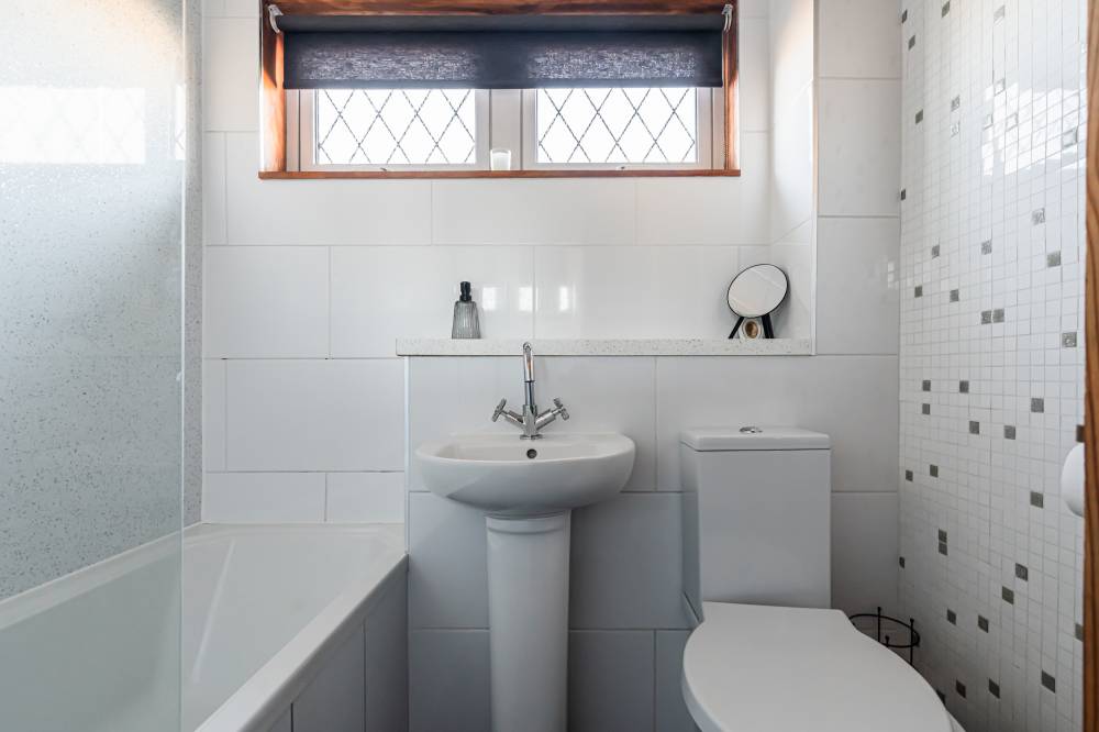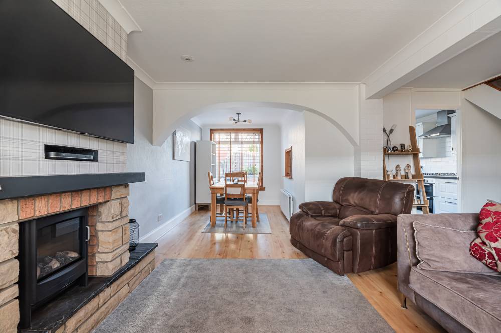 A front entrance porch leads into the bright and spacious lounge/diner, which enjoys a dual aspect allowing for excellent natural light throughout the day. The room offers ample space for both lounge and dining furniture, features a useful cloak cupboard, and includes a convenient breakfast hatch connecting through to the kitchen. The kitchen is well laid out and fitted with a range of integrated white goods, complemented by partial tiling in the splash areas for easy upkeep and under-unit lighting. The first-floor landing benefits from useful storage, including a linen cupboard and an additional large storage cupboard. The principal bedroom is well proportioned, front facing, and features fitted wardrobes along with plenty of space for freestanding furniture. Bedroom two is a comfortable rear-facing double with its own storage cupboard, whilst bedroom three is a versatile single room with an integrated double wardrobe, offering flexible use as a nursery or home office. The bathroom is finished with a combination of partial tiling and panelling and includes a shower over the bath and a heated towel rail.